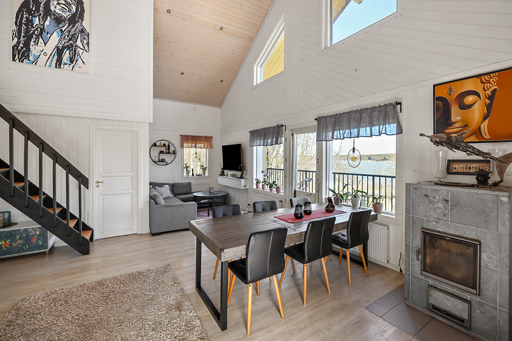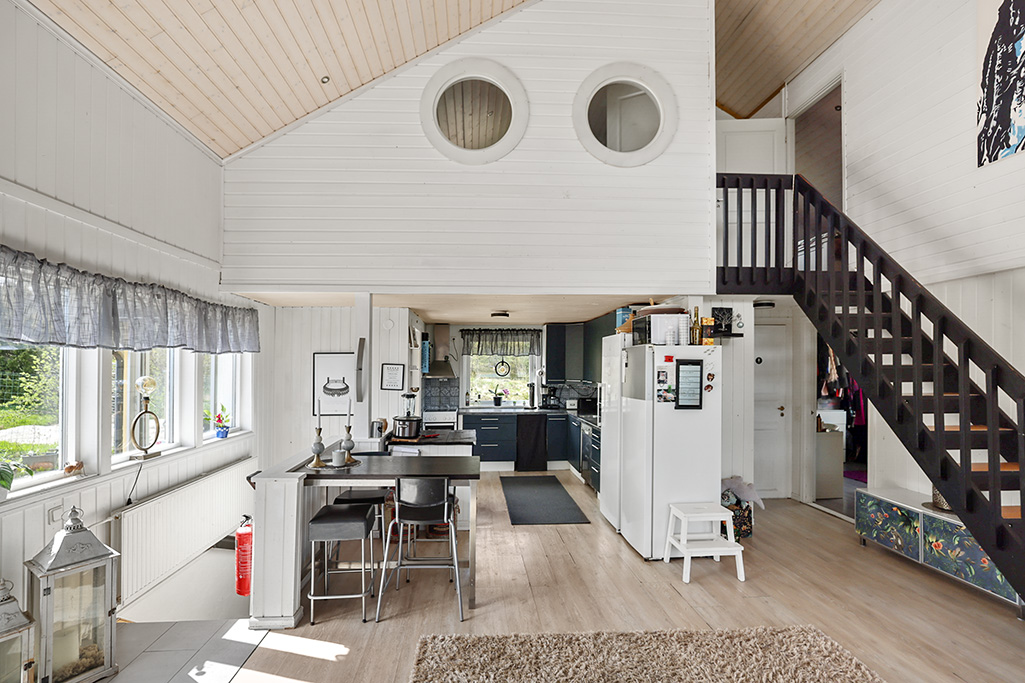 Första våningen inrymmer ett stort vardagsrum med full takhöjd som ger ett fint ljus och rymd, här finns även gott om utrymme för en större matplats och är i en öppen planlösning in till köket.