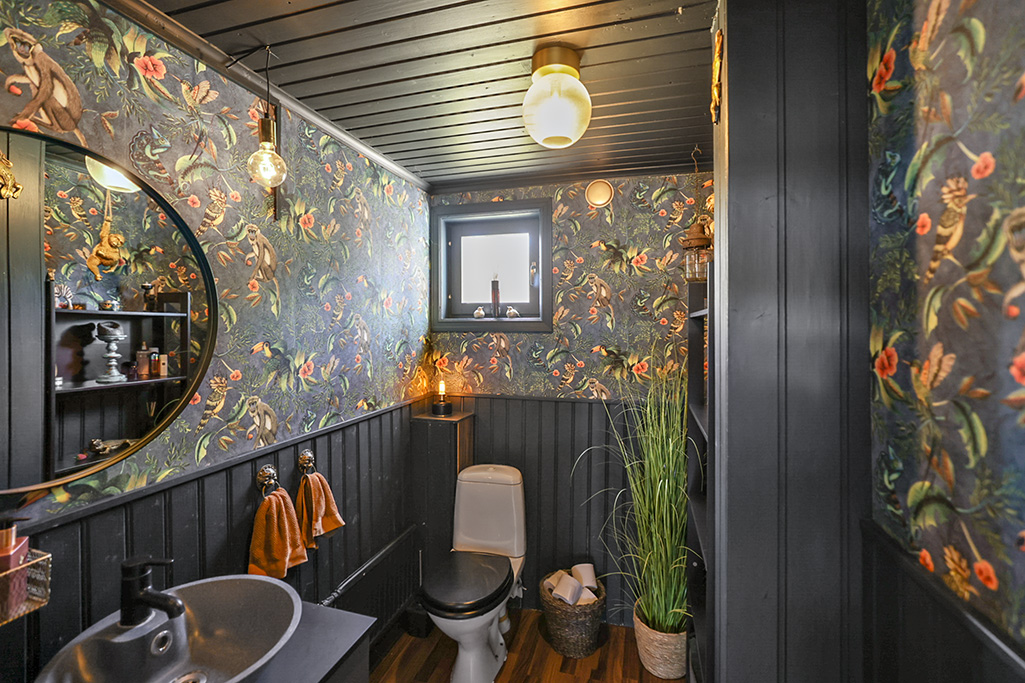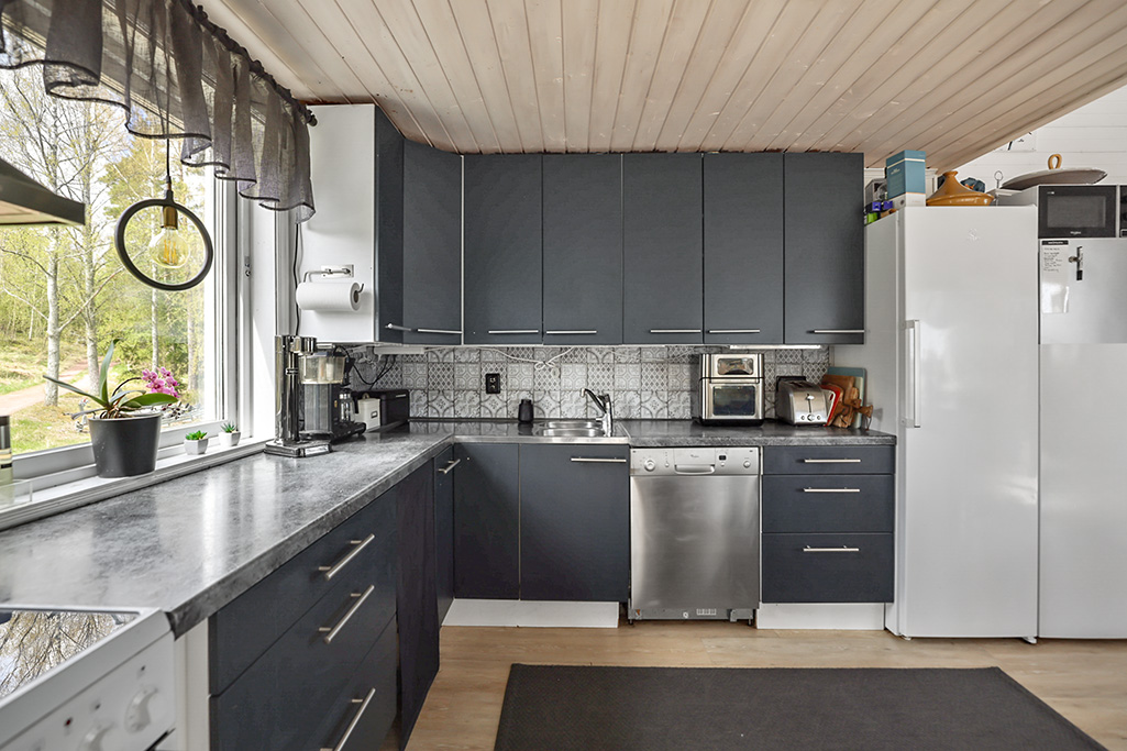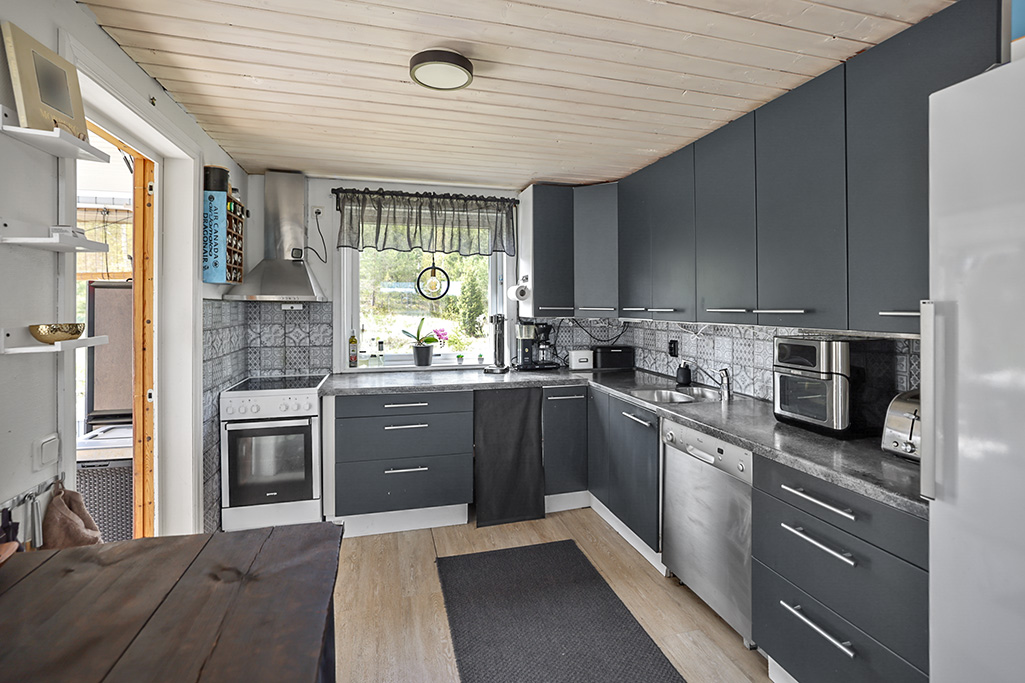 Köket är nymålat 2021 och har förnyade skåpluckor, laminatbänkskivor och vitvaror i form av spis med keramisk häll och ugn (2016), kyl (2024), frys (2022), mikrovågsugn och en förnyad diskmaskin. Invid köket finns även ett inglasat uterum för . Gästtoalett inrett med laminatgolv, målad träpanel i tak och nedre ½ av väggen är av målad träpanel och resterande väggyta är tapetserad. Det finns även två rymliga sovrum med fönster mot norr.