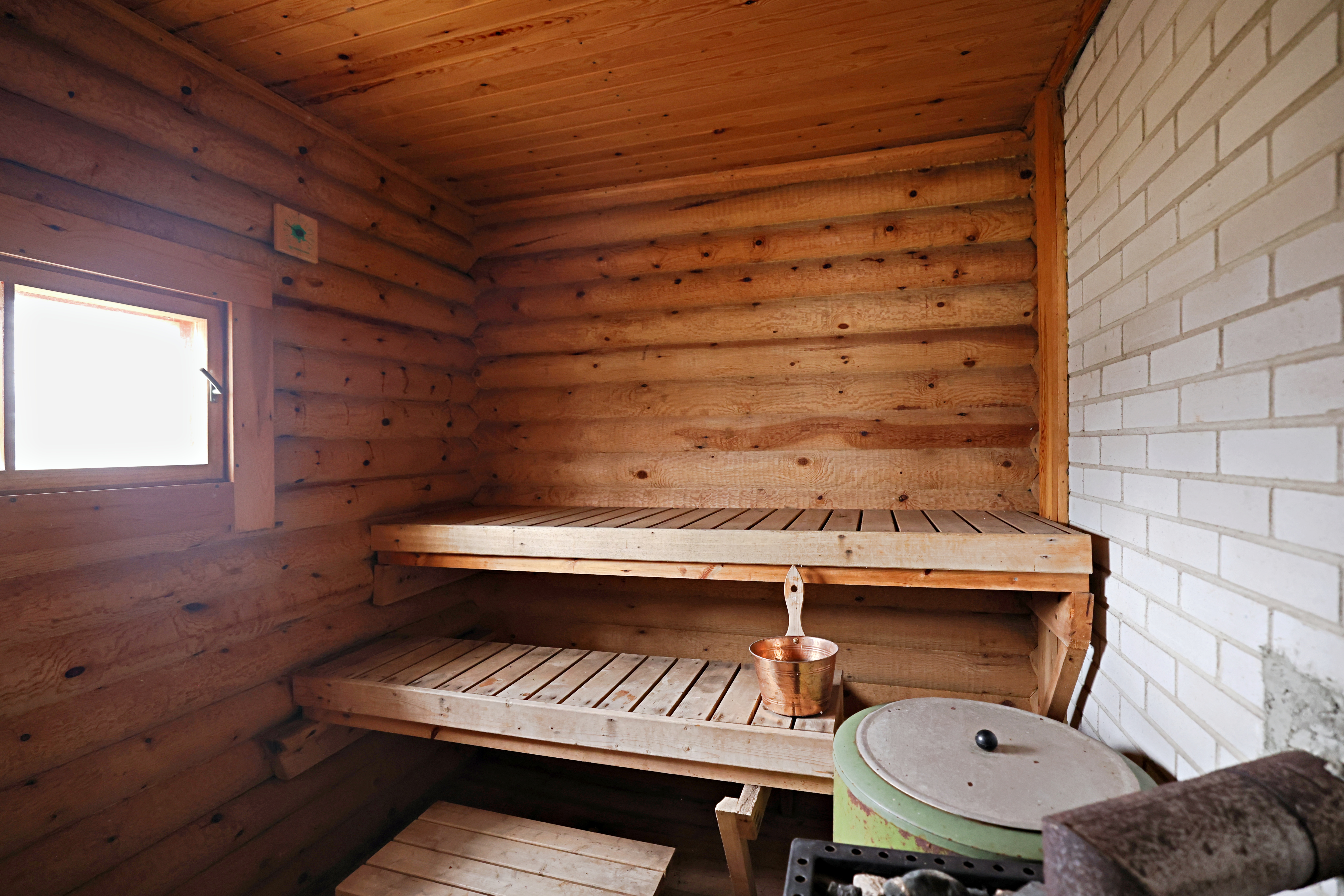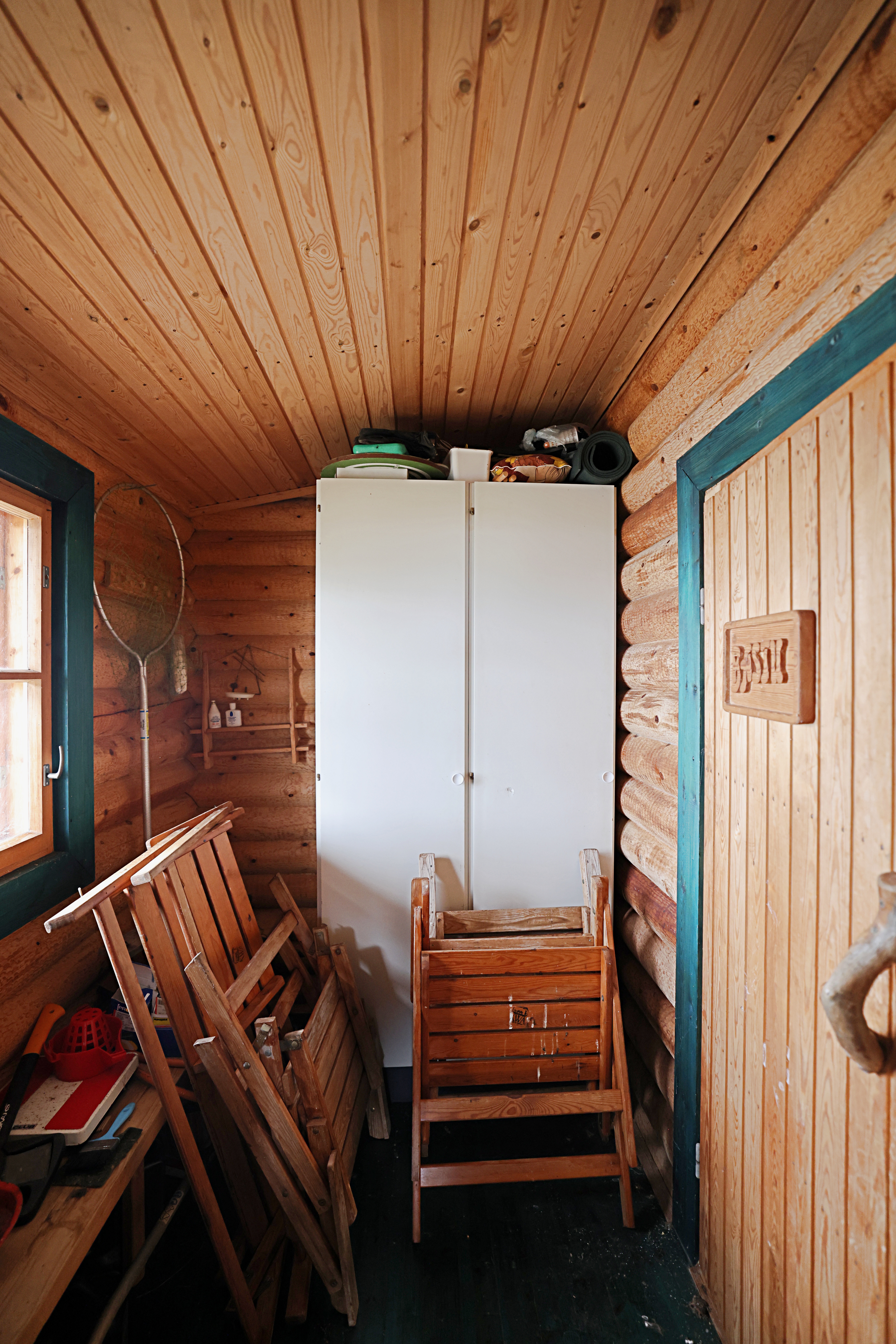 Omklädningsrummet och bastun har en egen ingång från terrassen. Bastun är försedd med en vedeldad bastuspis och en stor vedeldad varmvattenberedare.