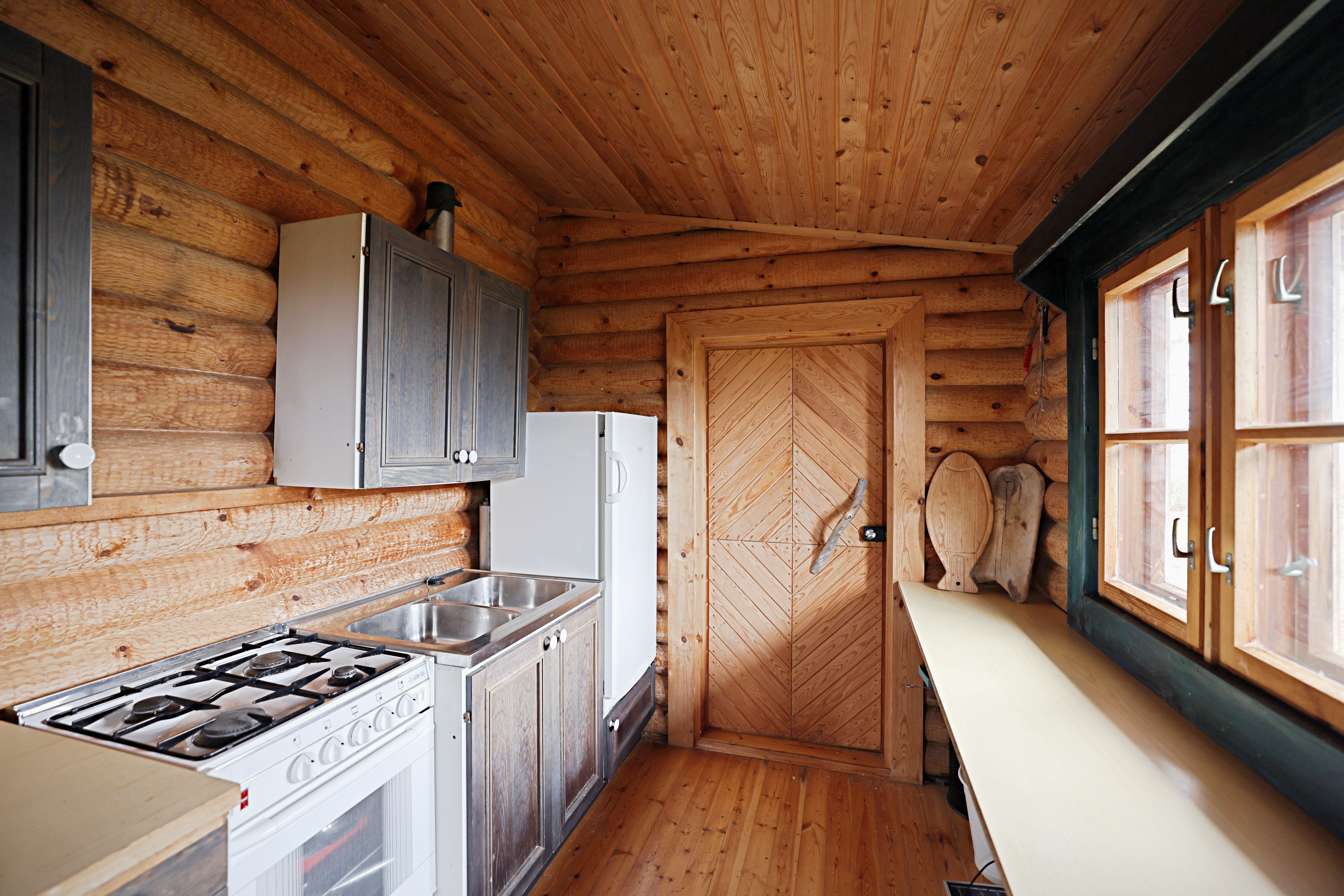 Köket har en egen in-/utgång vid norra sidan av stugan och är inrett med köksskåp, bänkskiva, diskbänk, gaskyl och en gasspis med ugn.
