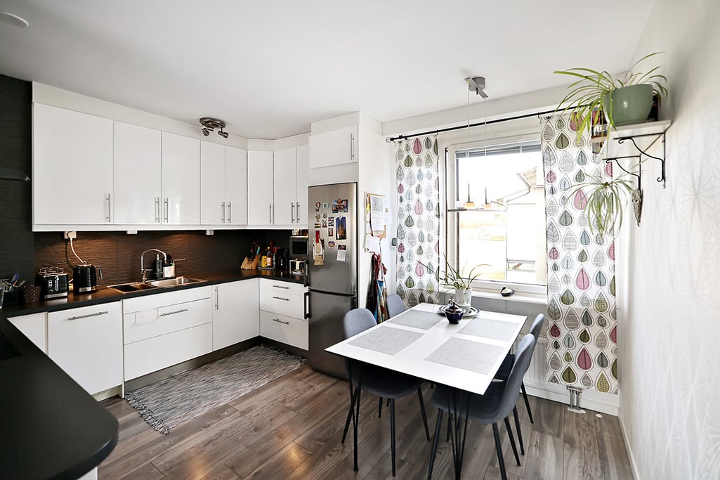 Köket har vita skåpluckor, gott om bänkyta och vitvaror i form av kombinerad kyl och frys, induktionshäll, fläkt, ugn och diskmaskin.