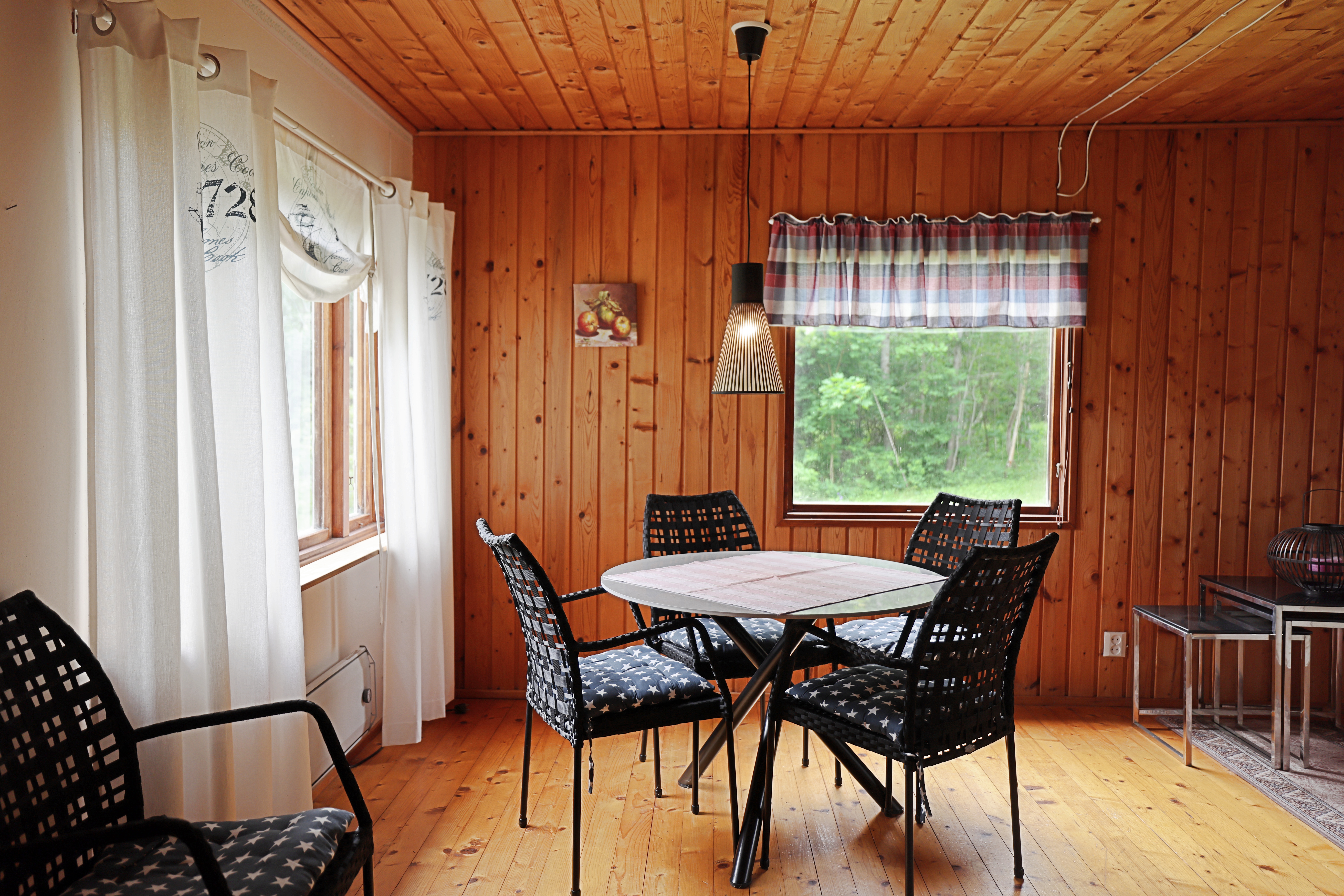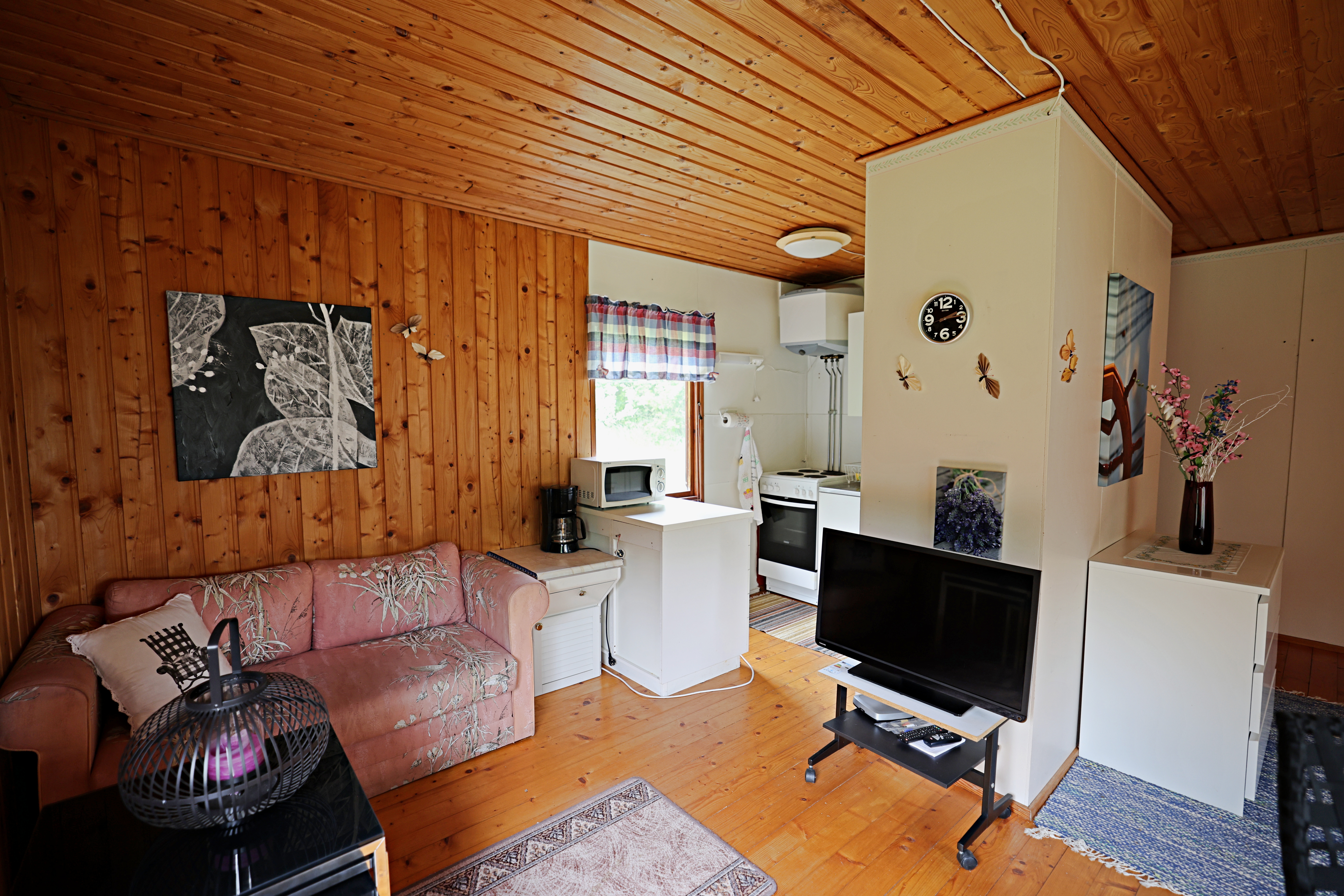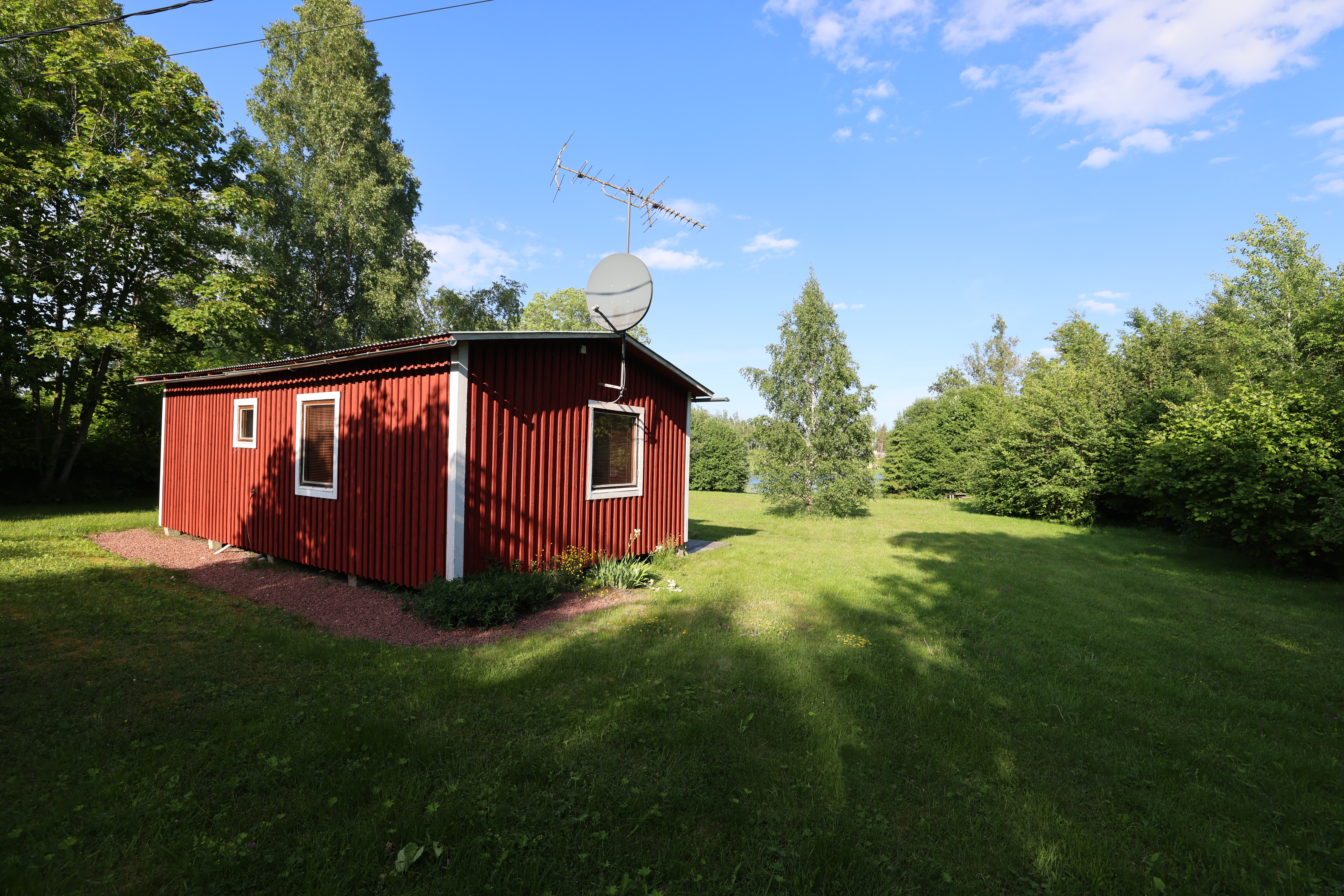 - Öppet kokvrå, matsplats och allrum, badrum, sovrum och litet förråd/sovrum som inte är färdigställt. Stugan har en altan under tak.
