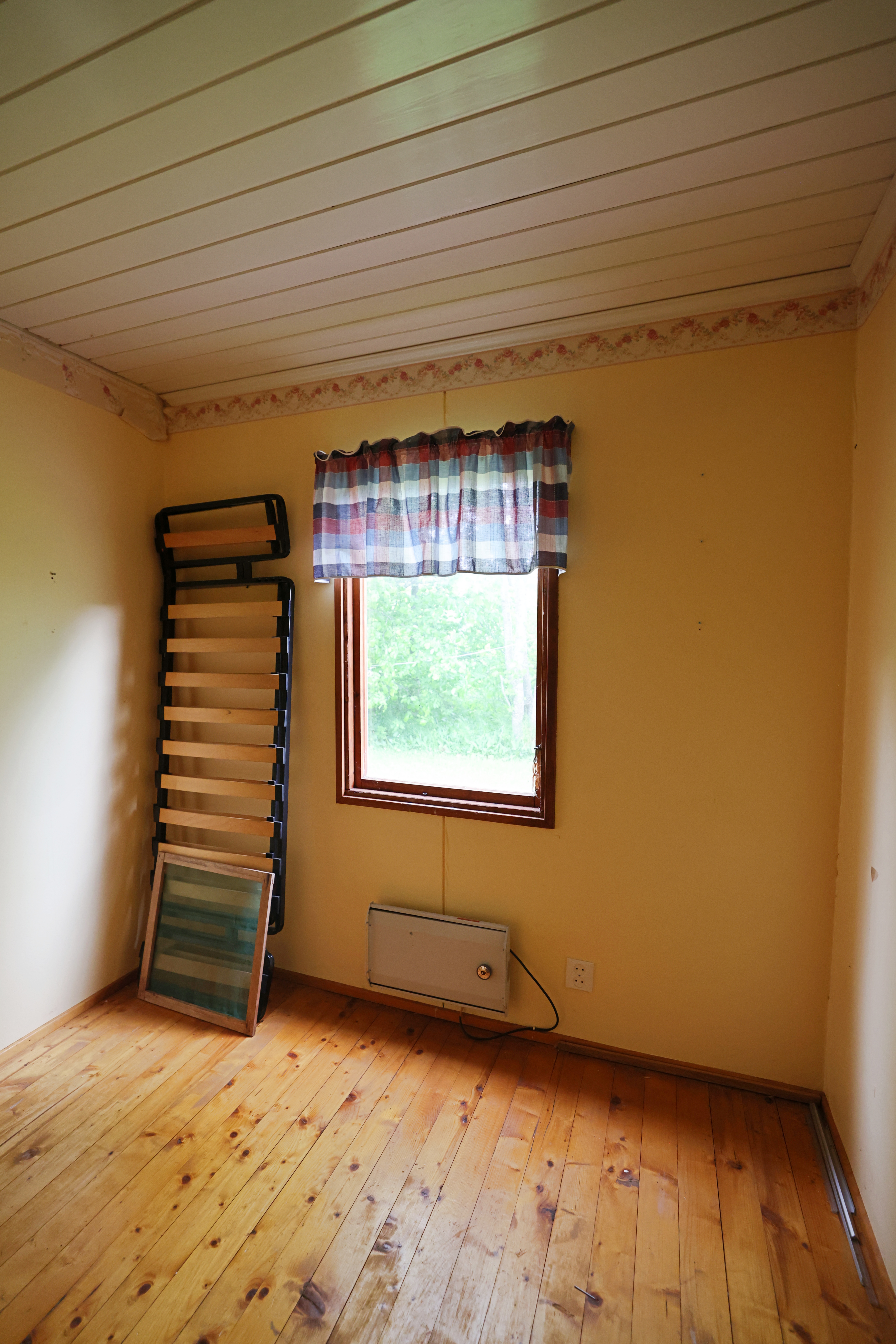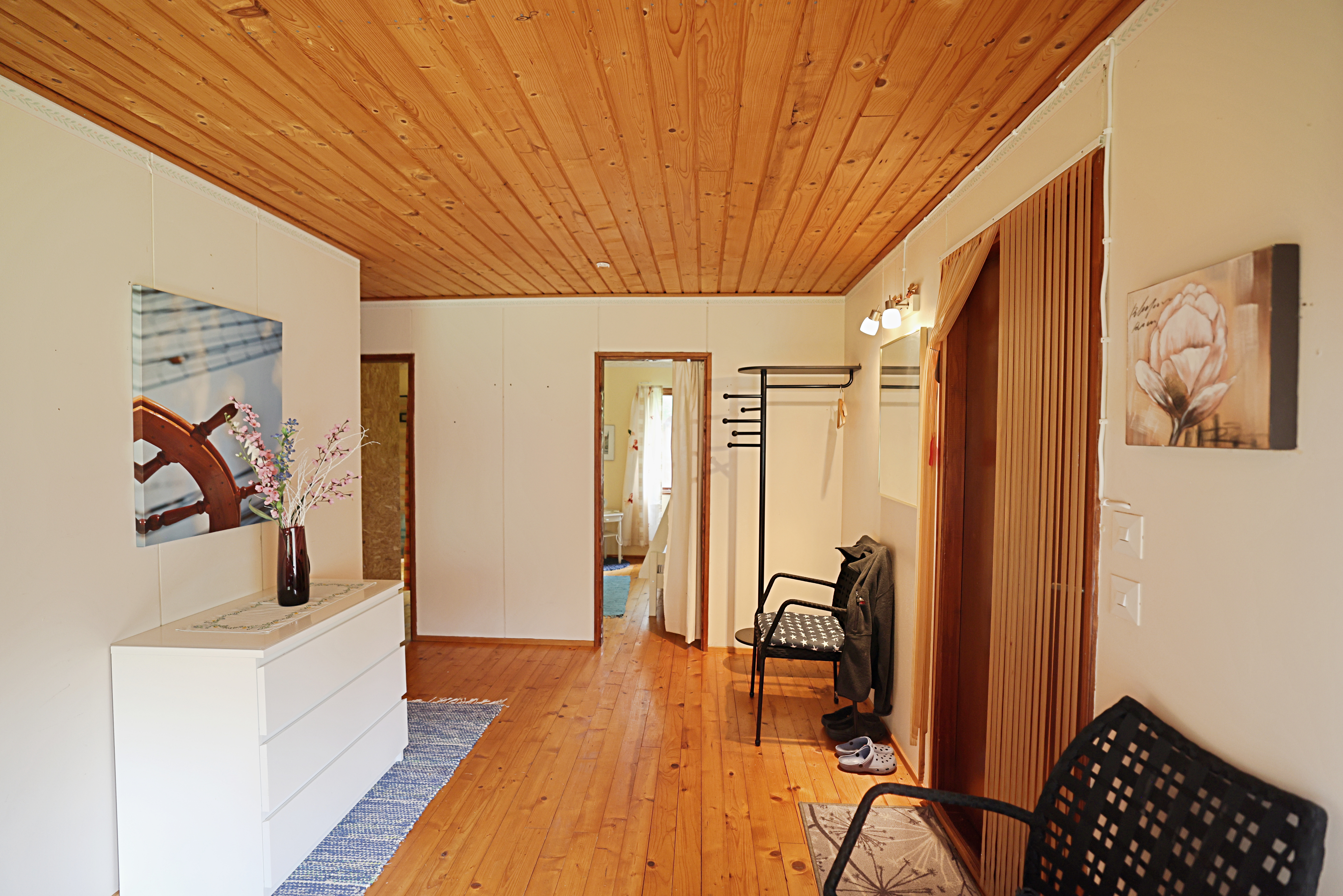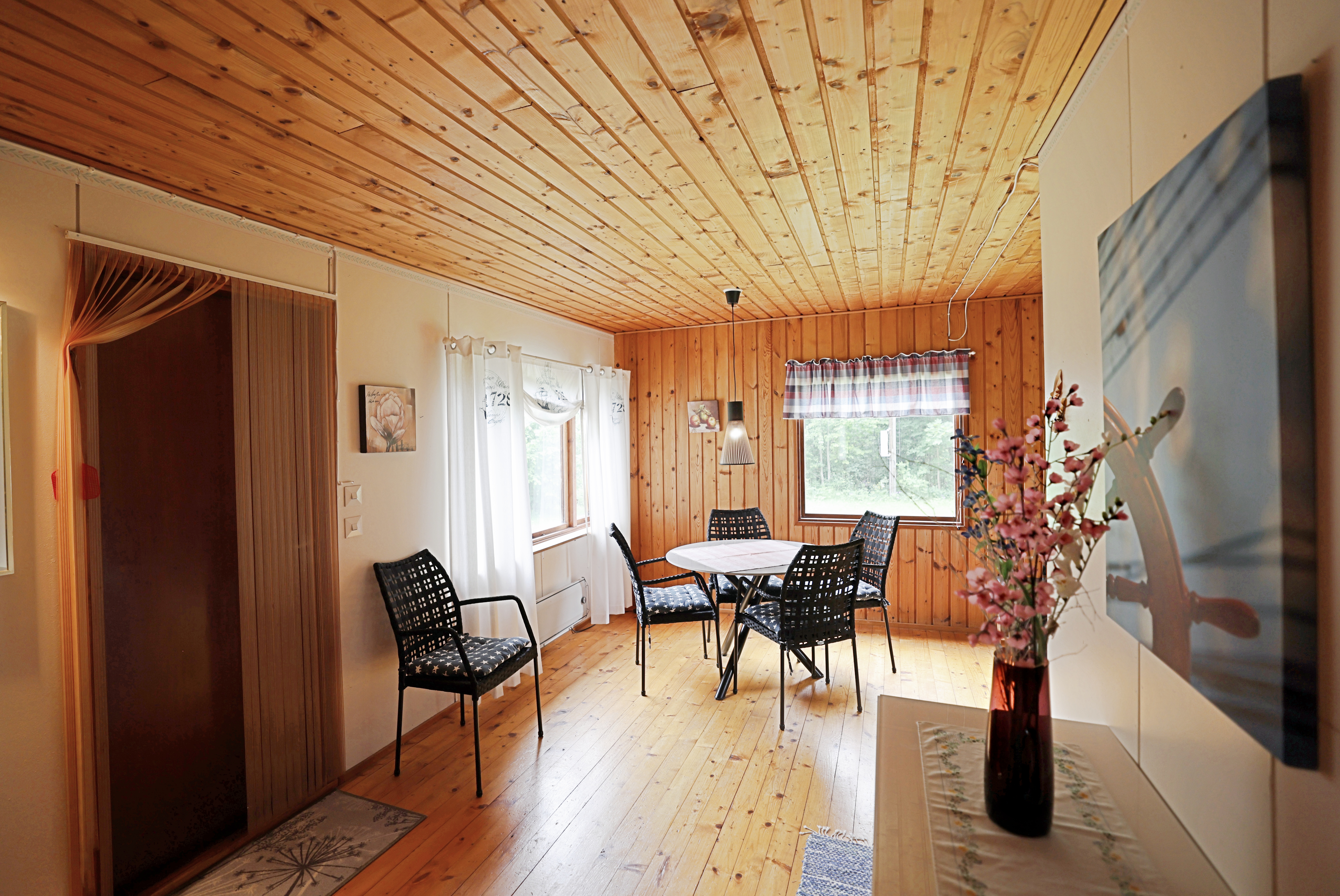 - Öppet kokvrå, matsplats och allrum, badrum, sovrum och litet förråd/sovrum som inte är färdigställt. Stugan har en altan under tak.