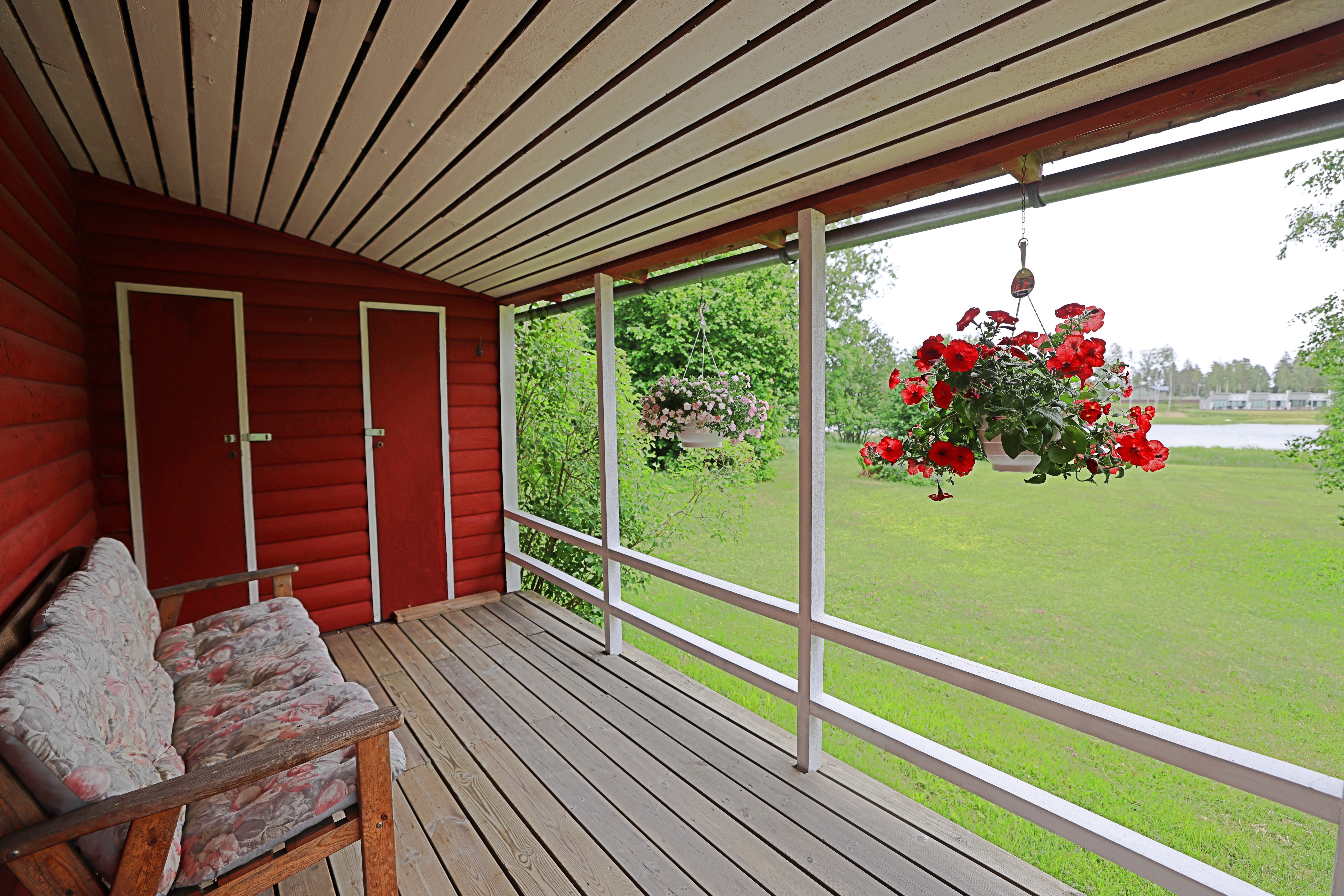 Rymlig veranda under tak med ett vackert österläge.