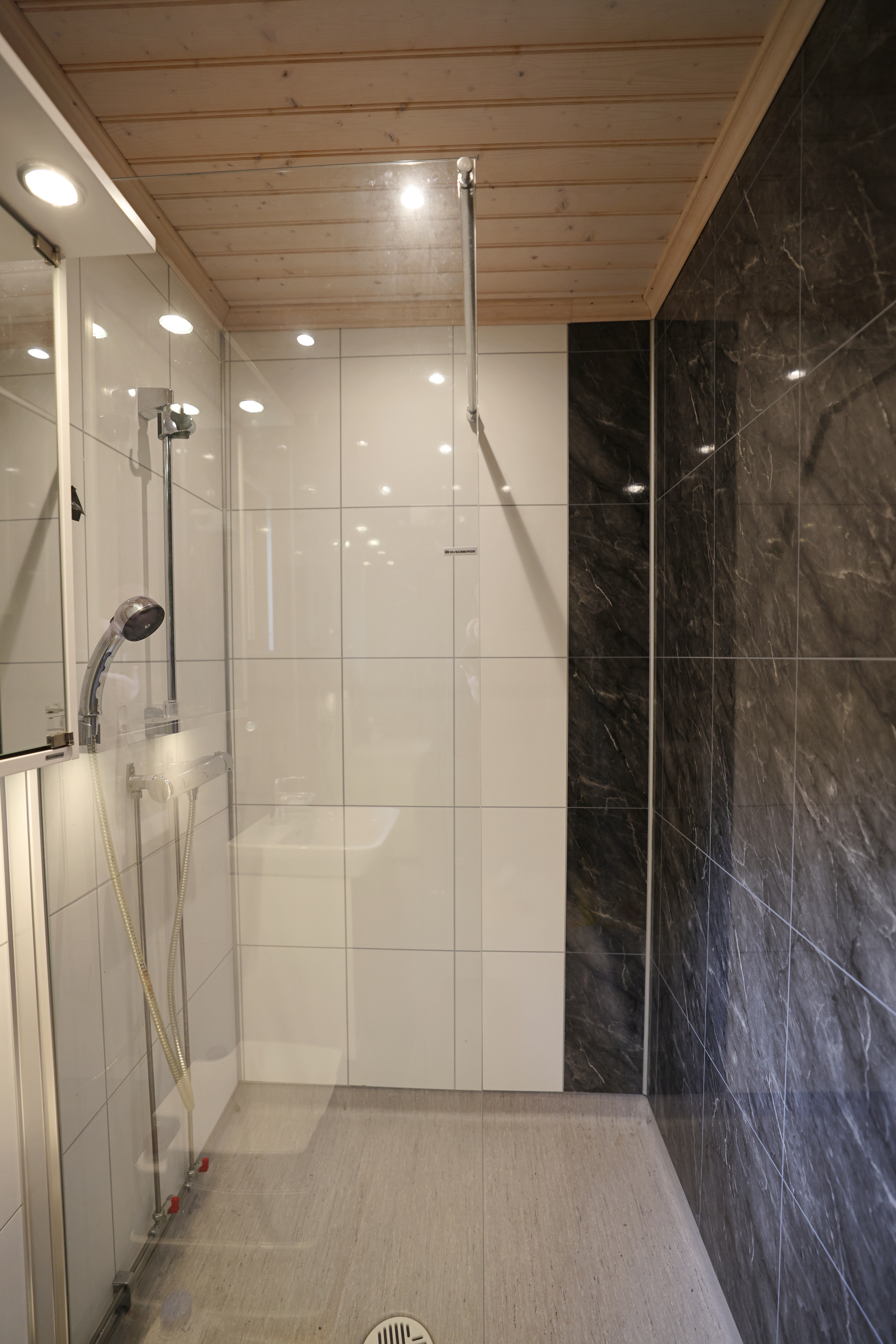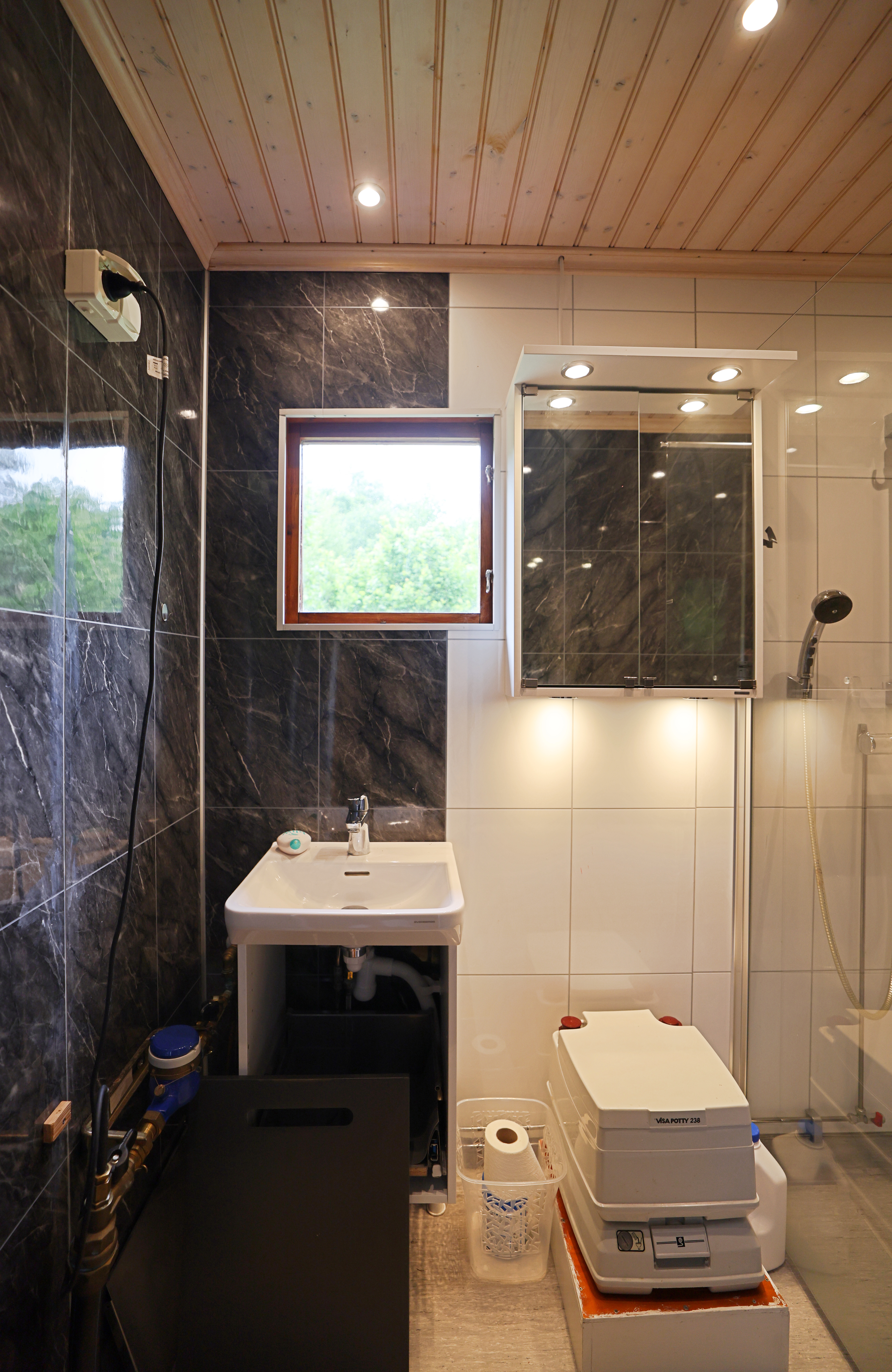 Badrummet är modernt inrett med dusch med duschvägg, handfat med underskåp, spegelskåp, Visa Potty 238 (10l tömningstoalett) plastmatta på golvet och skivade väggar.