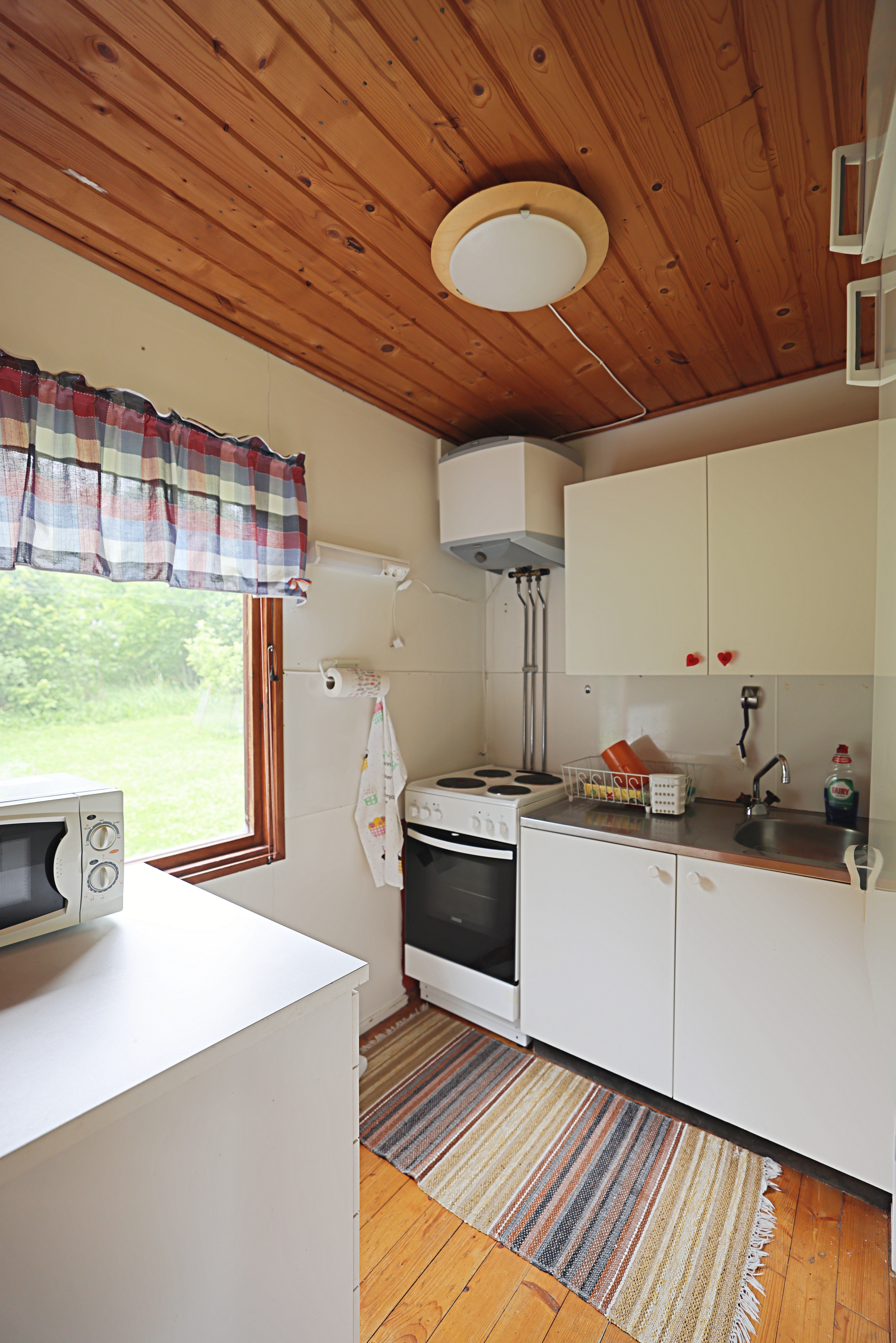 I kokvrån finns en liten varmvattenberedare som är kopplad till kökskranen, handfatskranen och duschkranen i badrummet.