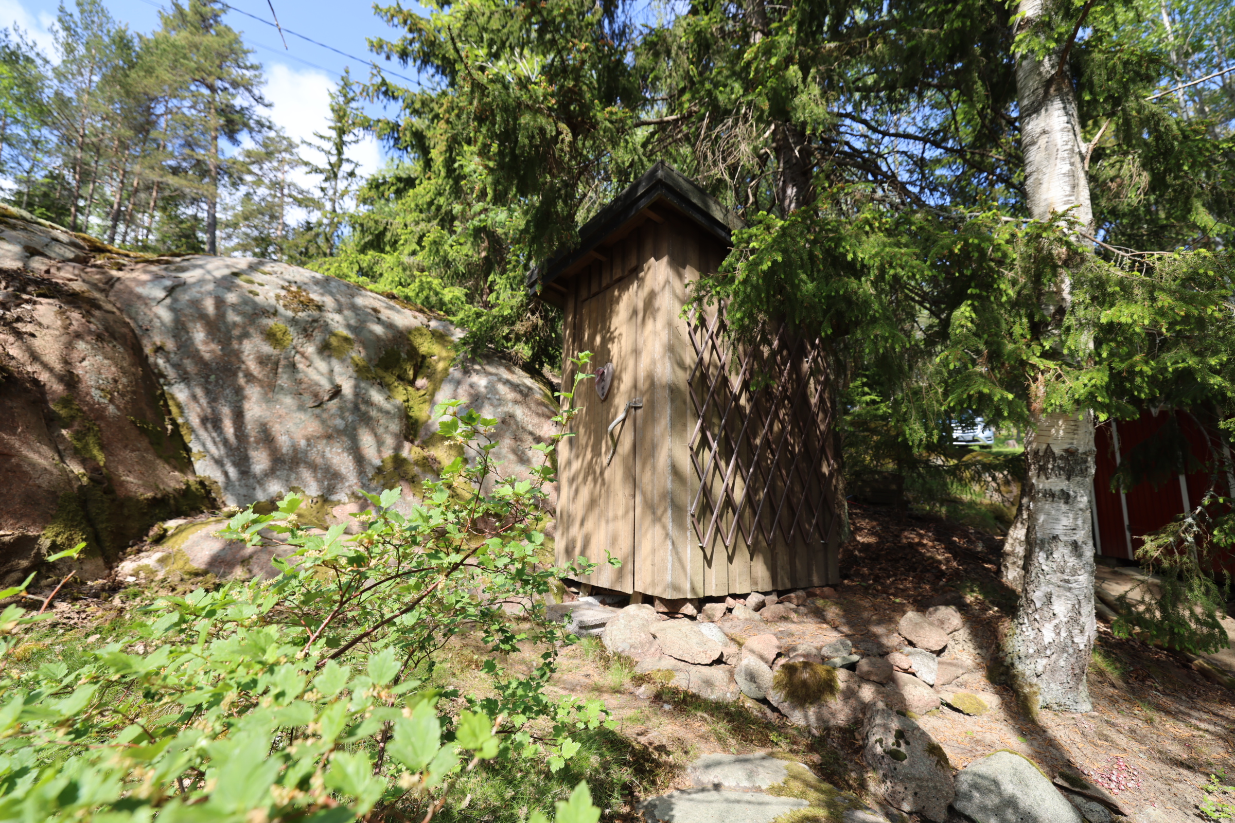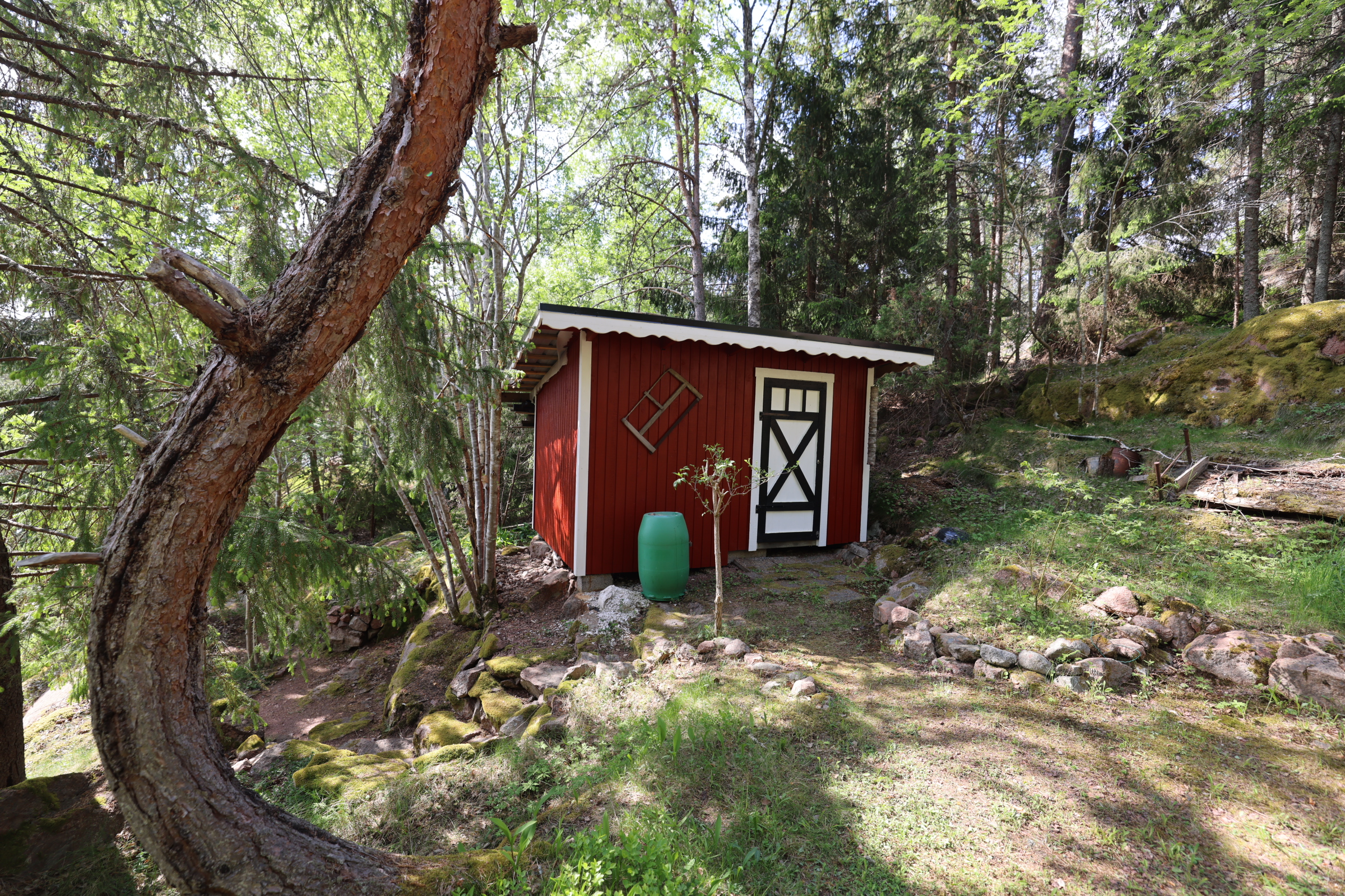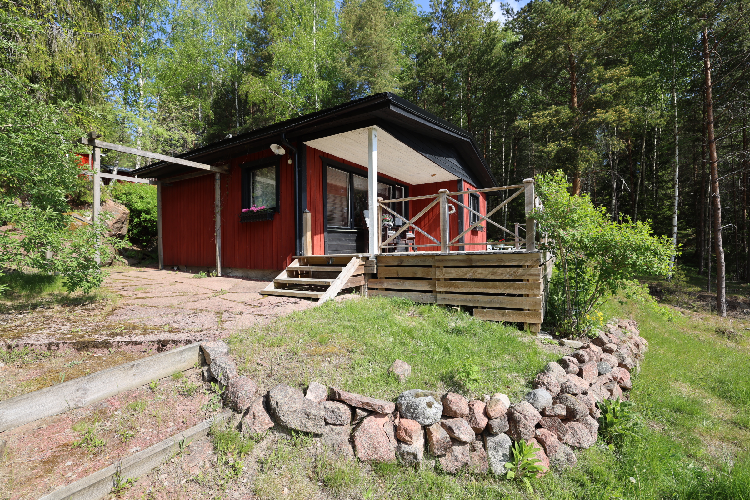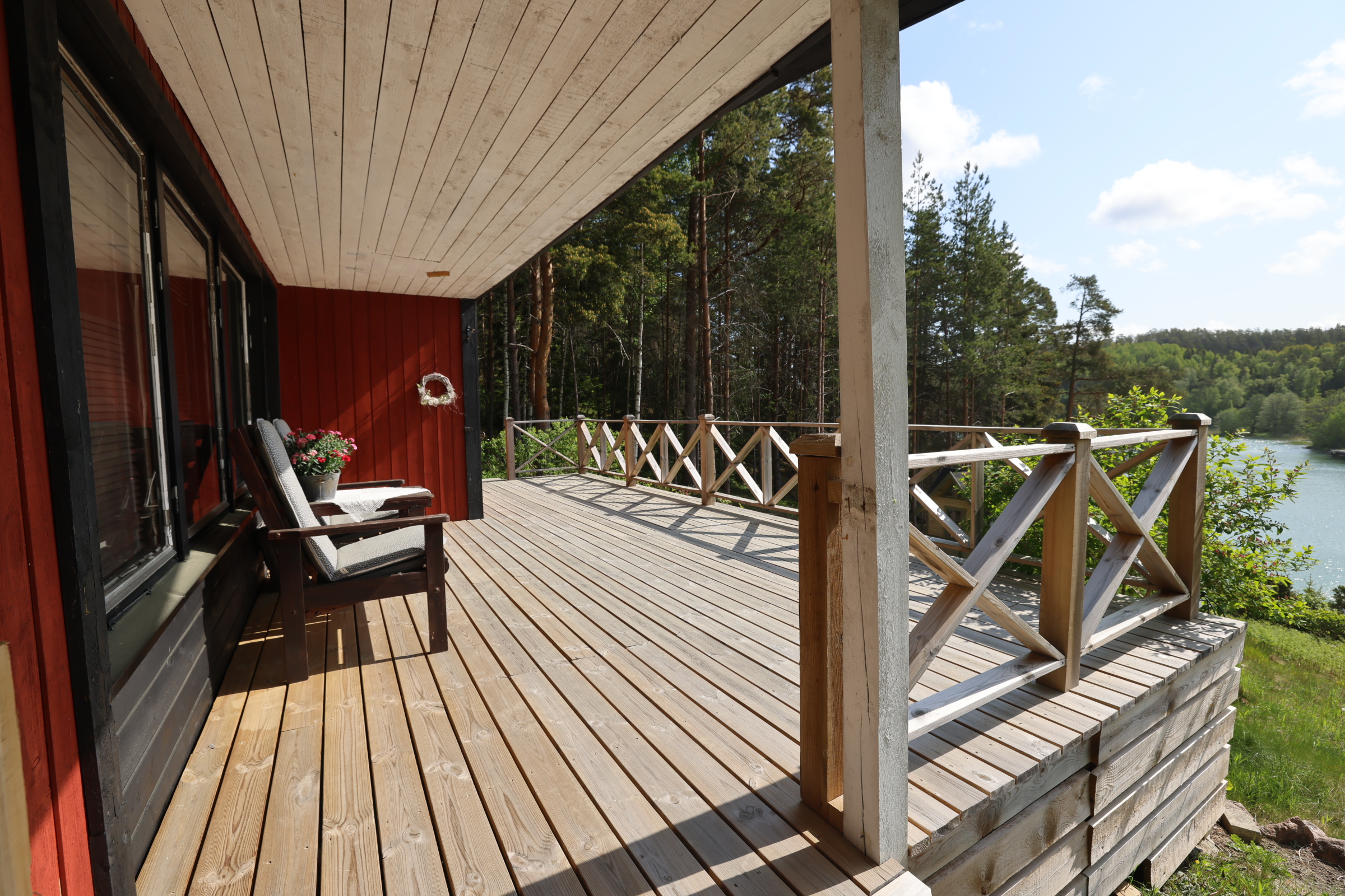 - Stor altan med söder- och österläge. Lusthus nedanför stugan.