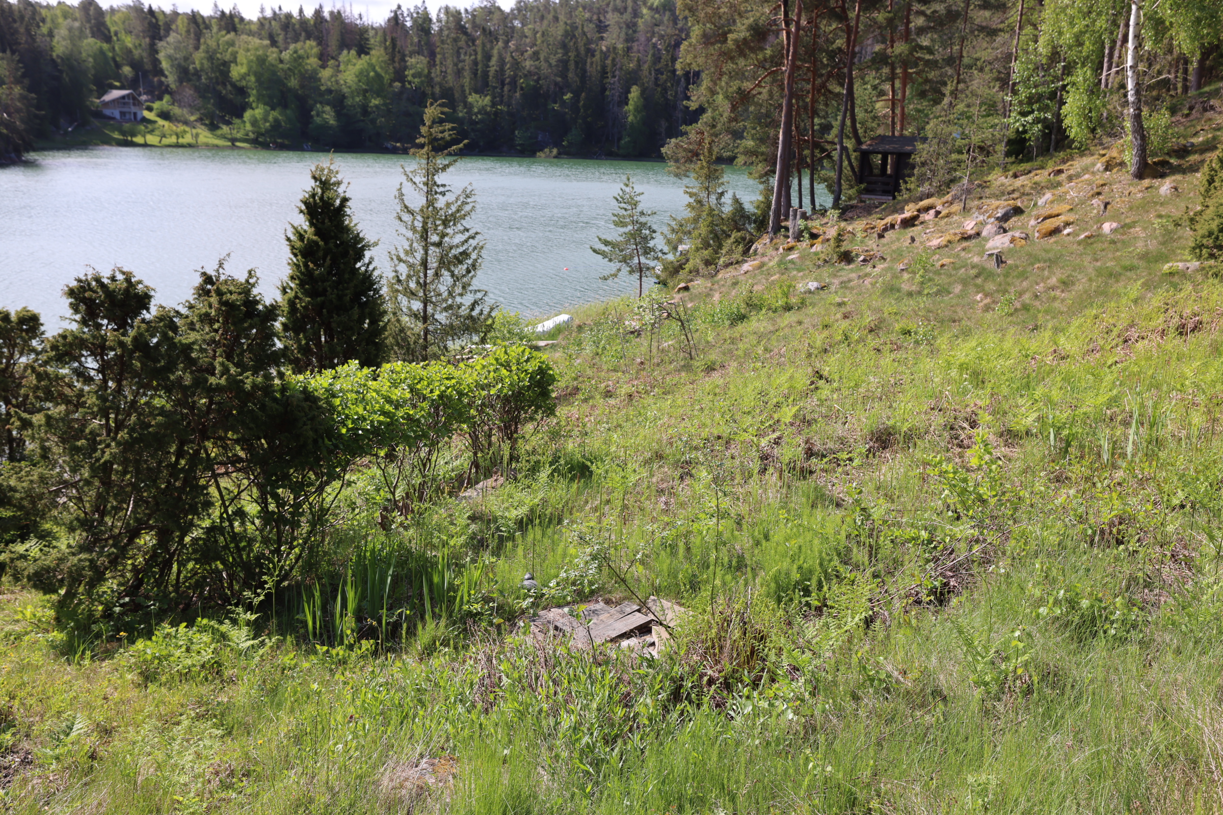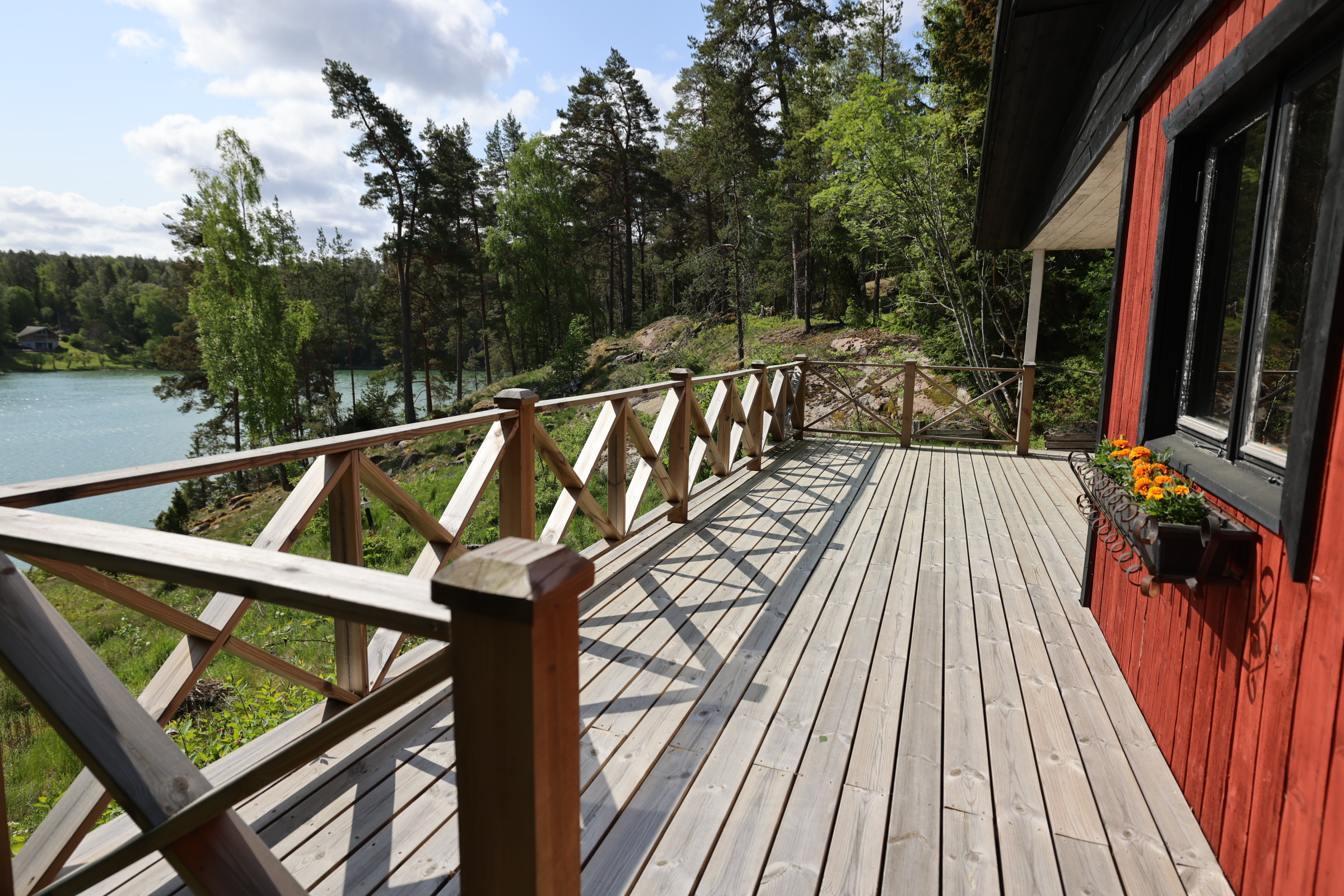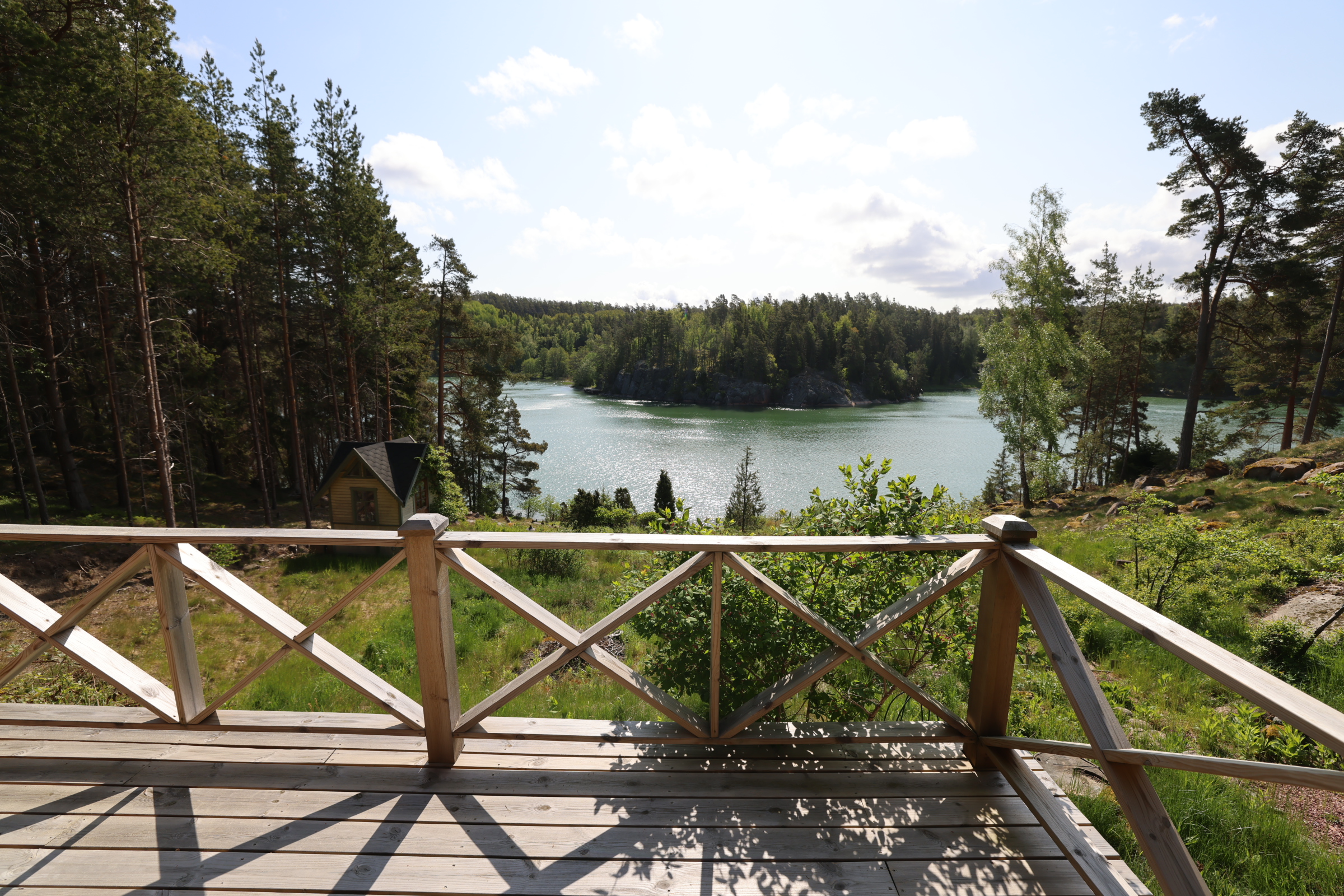 - Stor altan med söder- och österläge. Lusthus nedanför stugan.
