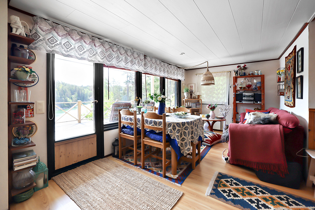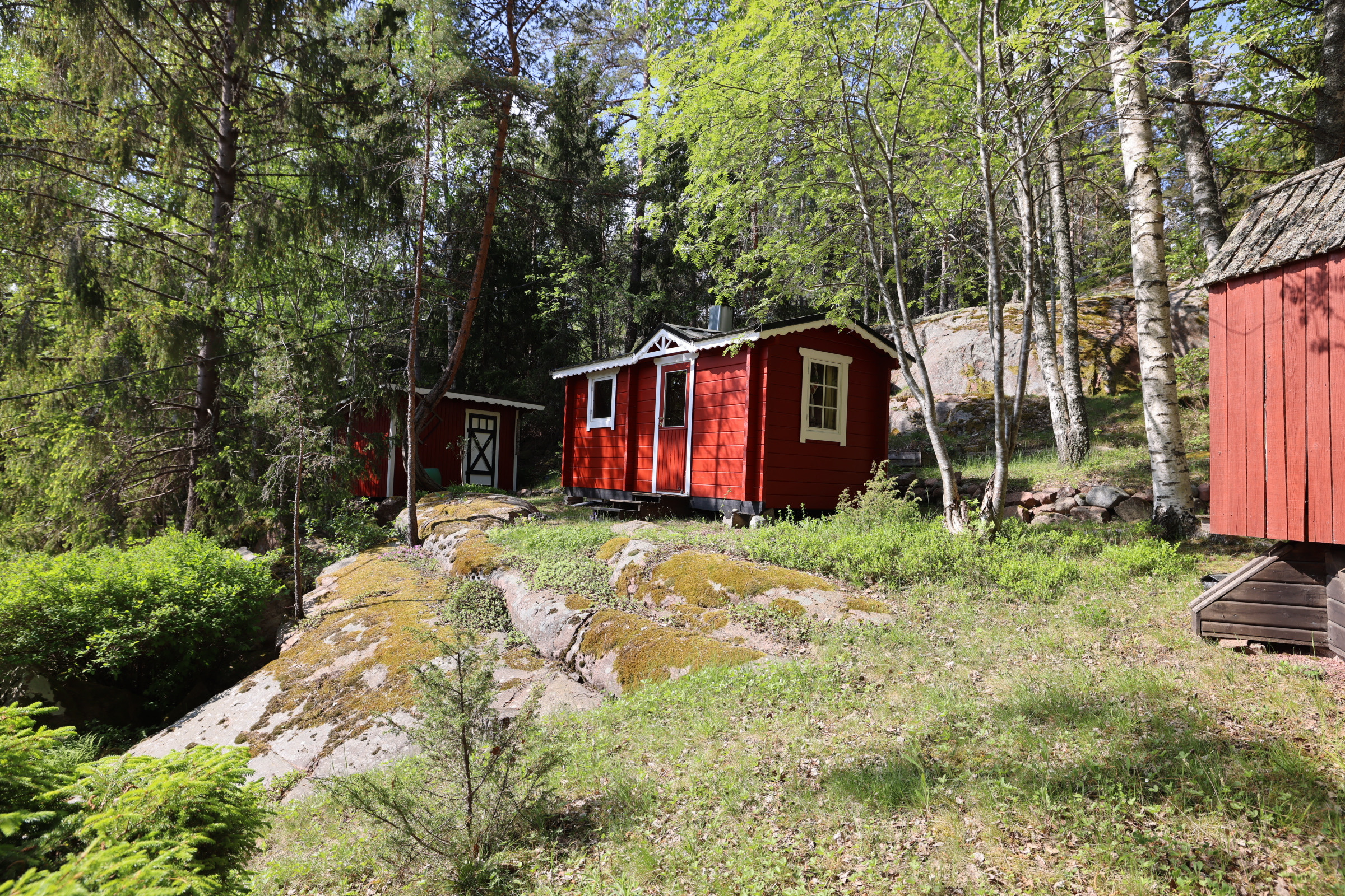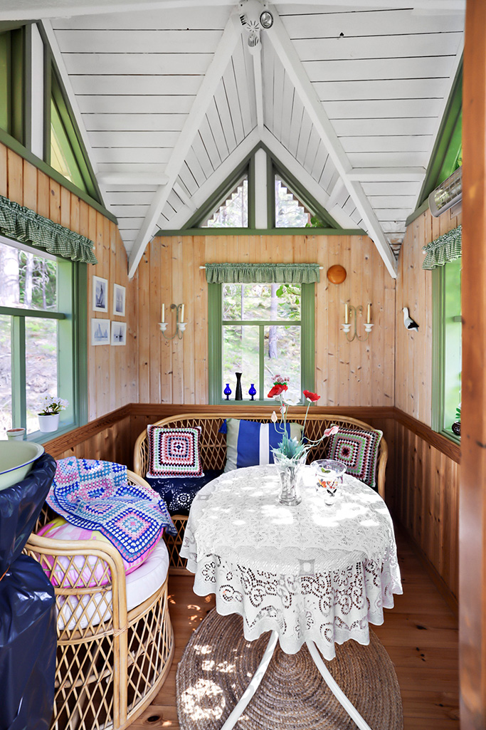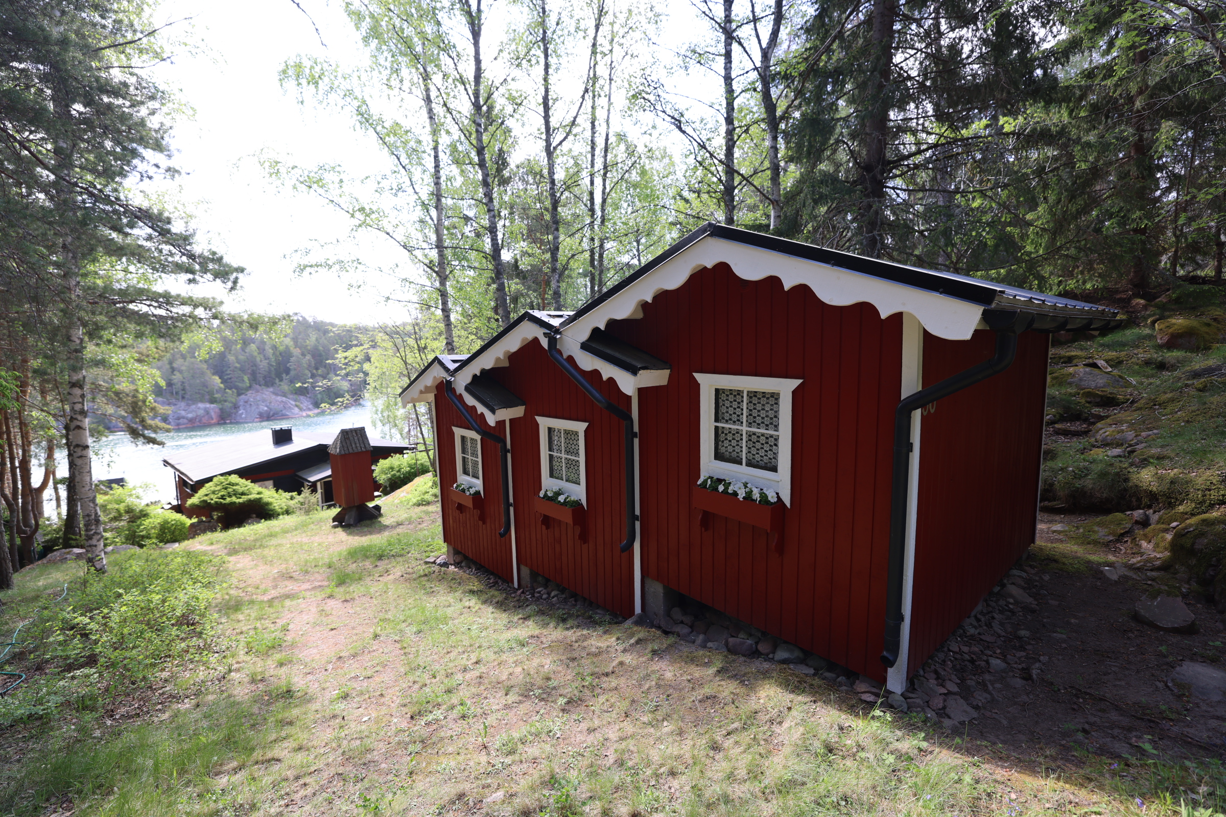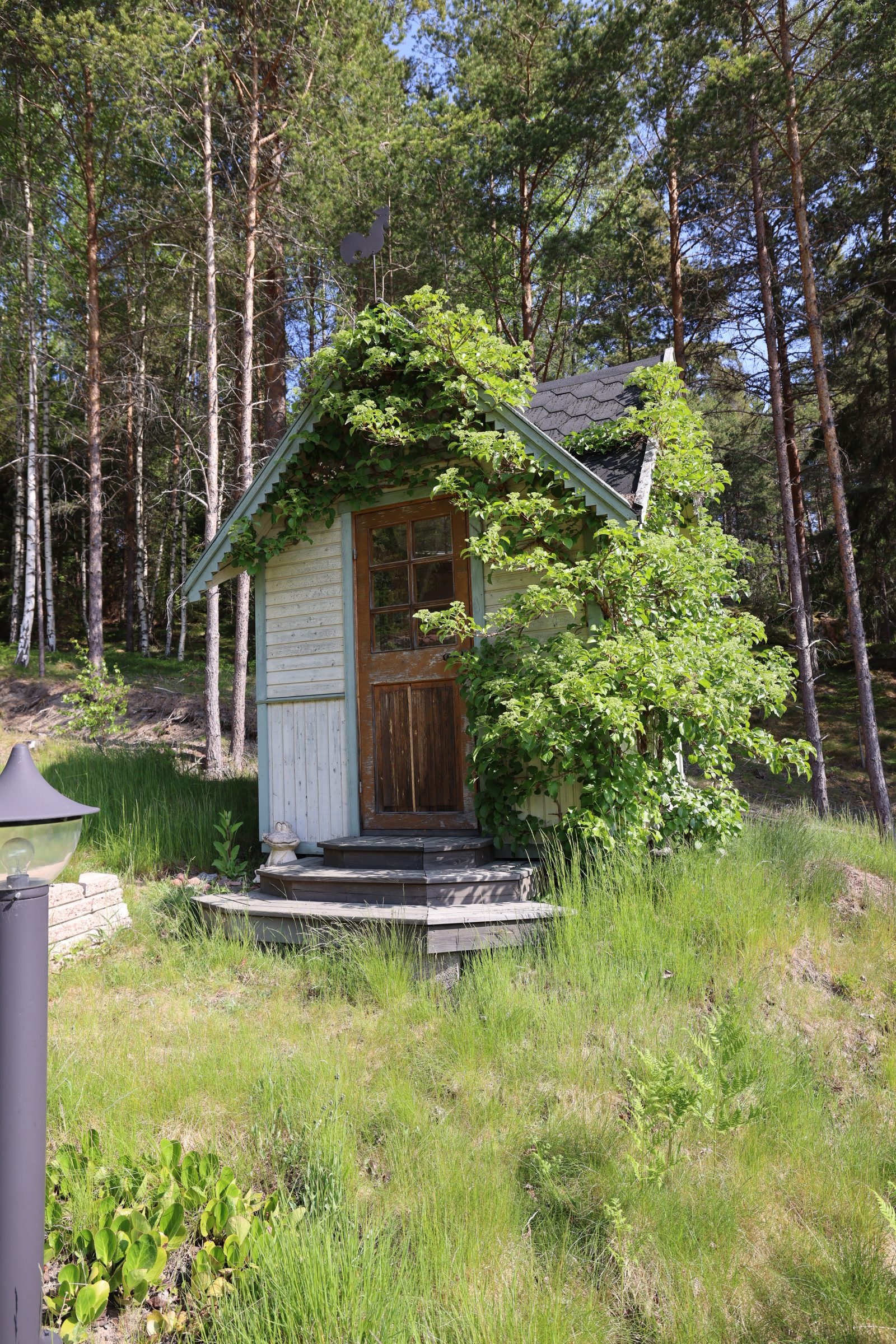 - Stor altan med söder- och österläge. Lusthus nedanför stugan.
