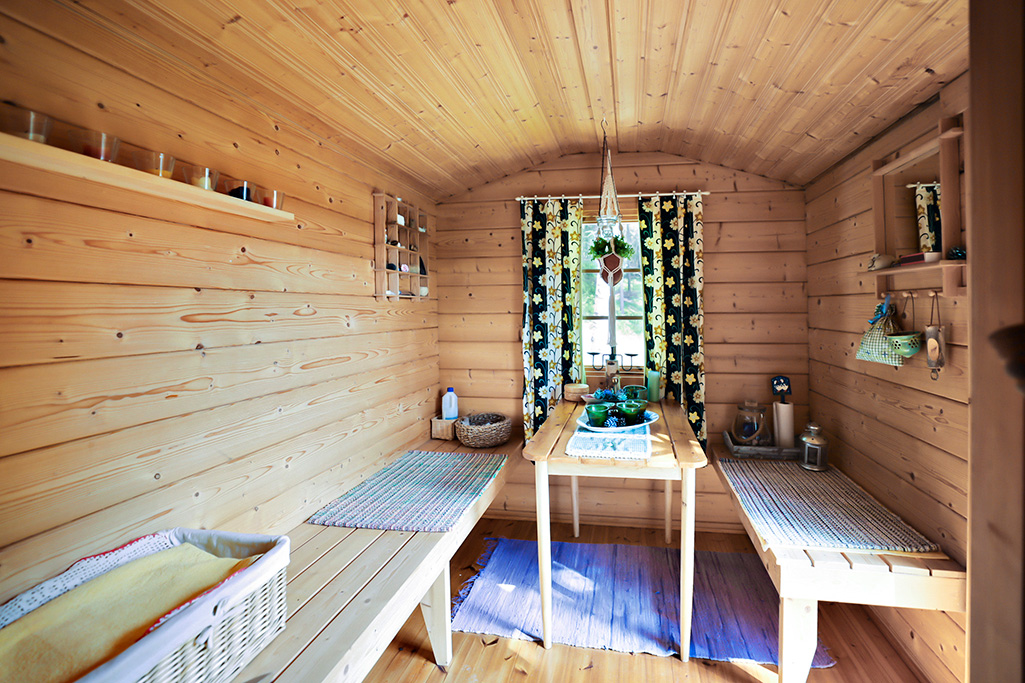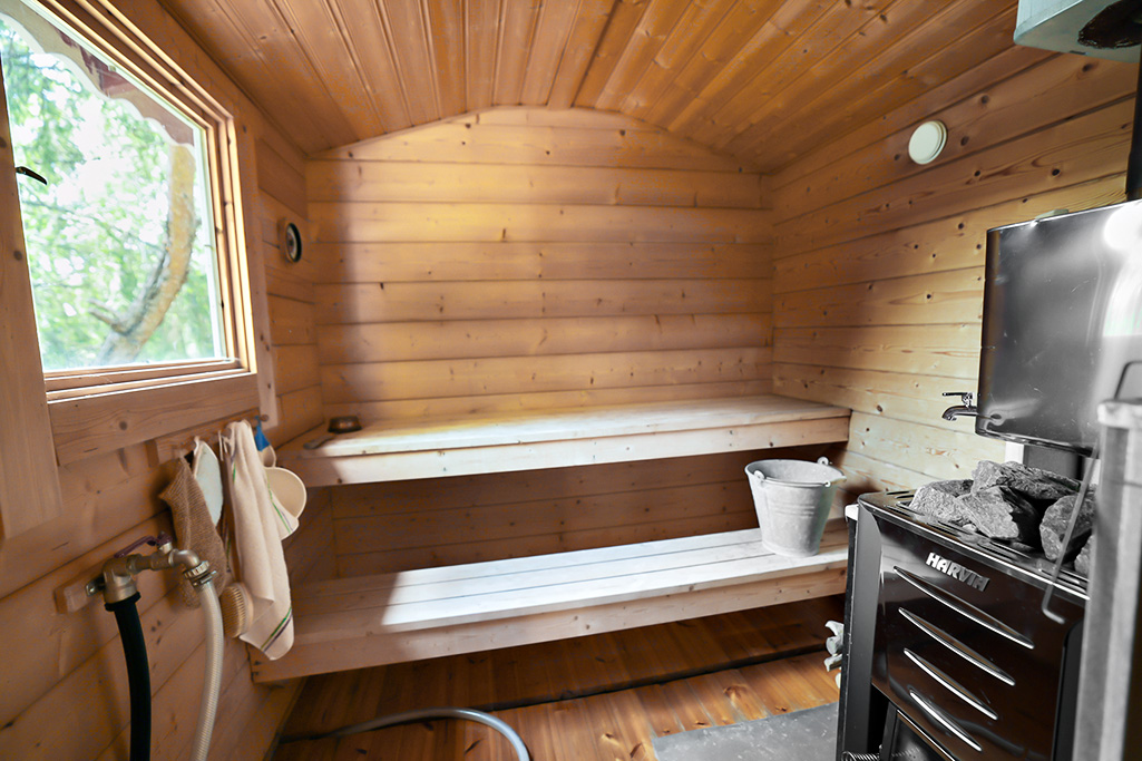 Bastun rymmer ett omklädningsrum/gästrum och bastuavdelning. Bastun inredd med sommarvatten och en vedeldad bastuspis av märket Harvia med varmvattenboiler.