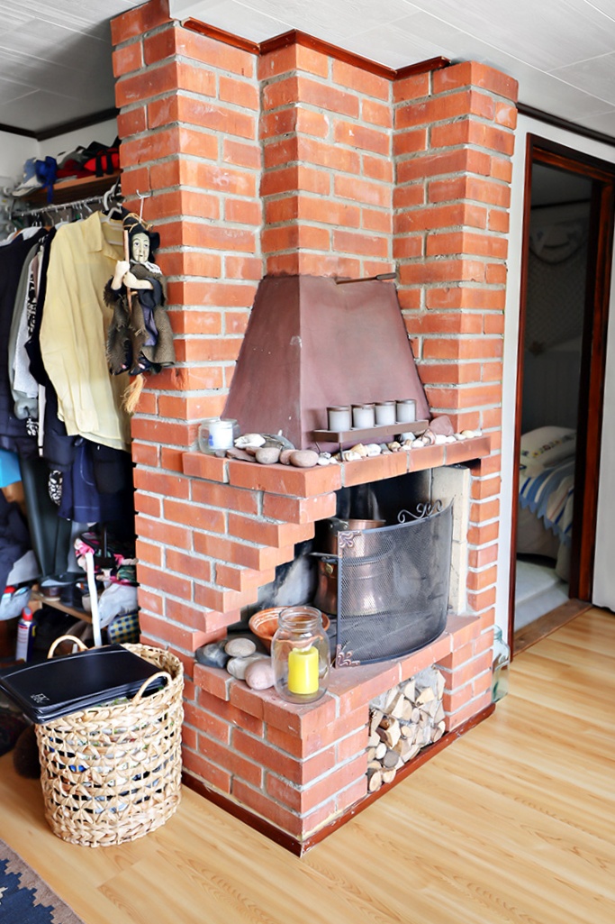I vardagsrummet finns en stor murad vedspis. Köket är utrustat vitvaror i form av kyl/frys, gasspis med ugn och fläkt. El finns anslutet till fritidsbostaden.
