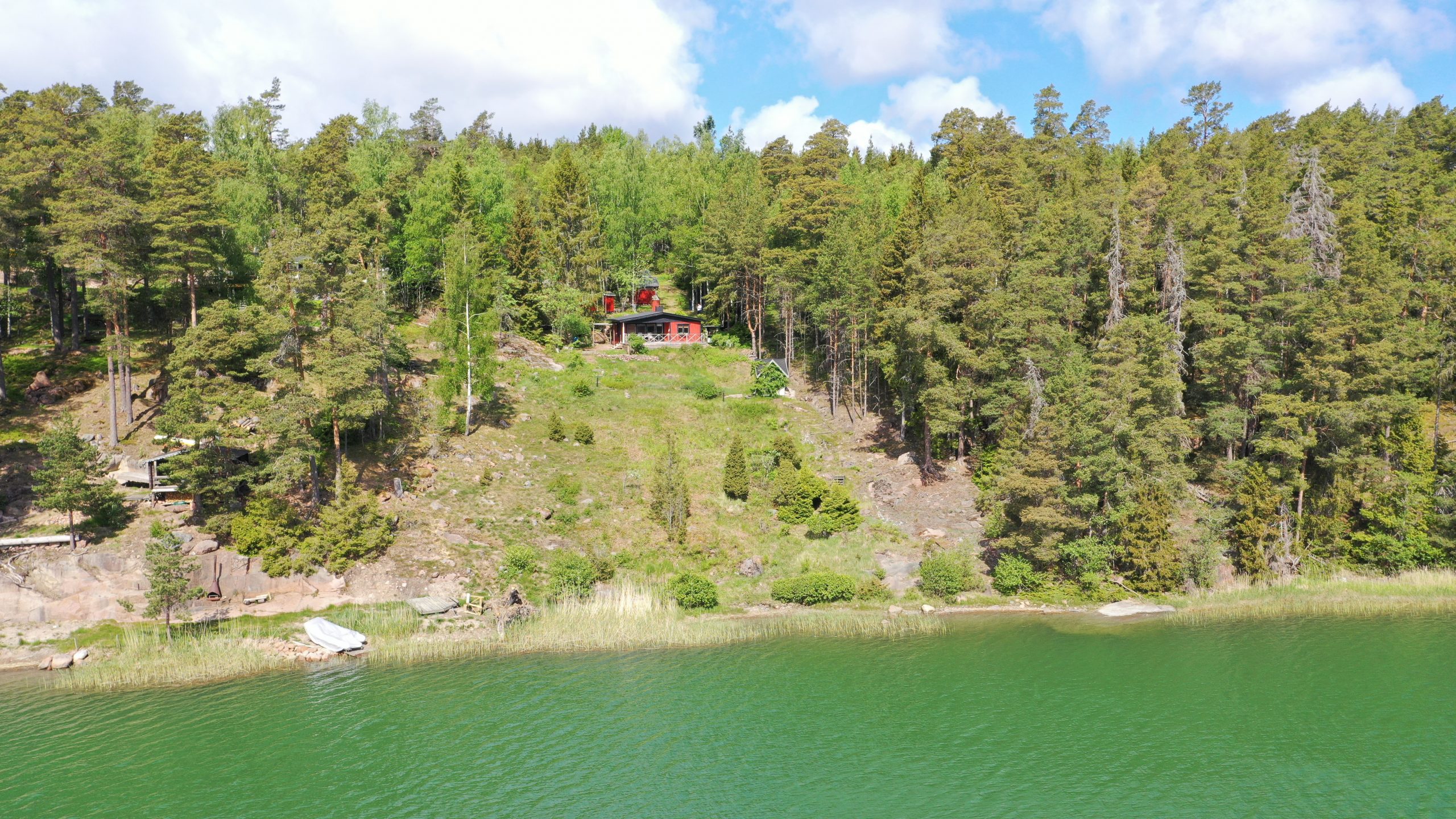 Bra båtplatser för mindre båtar vid stranden och vill man ha en större båt så kan det ordnas genom att anlägga t.ex. en flytbrygga och en boj.